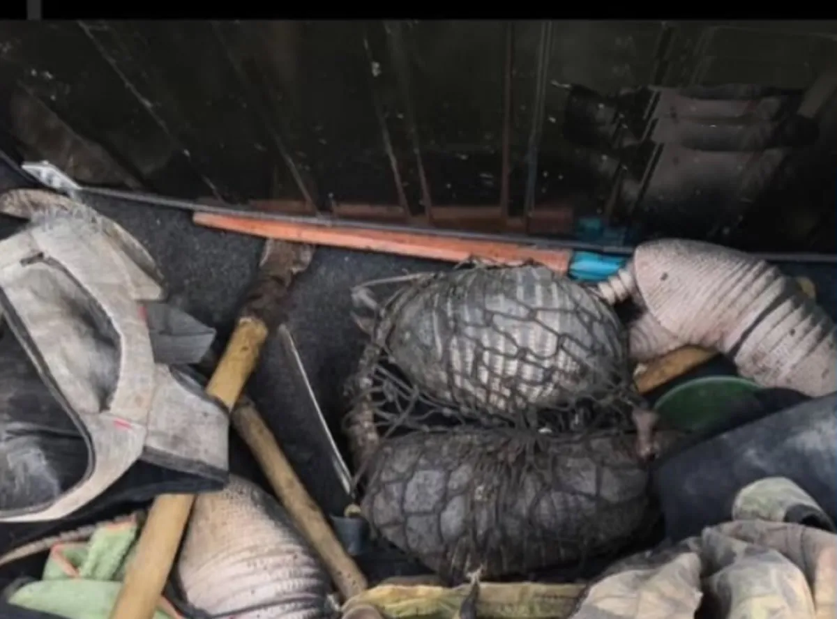 Durante a abordagem a um veículo suspeito, os policiais localizaram seis tatus — cinco vivos e um abatido — além de três cães de caça. Também foram apreendidos instrumentos comumente utilizados na caça ilegal, como pás, enxadecos, facão, foices, lanternas e celulares.