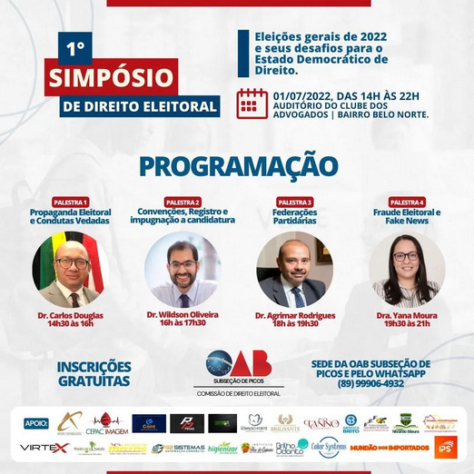 A OAB – Subsecção de Picos, através da Comissão de Direito Eleitoral, promove nesta sexta-feira (01) o 1° Simpósio de Direito Eleitoral. O evento terá início às 14h, com previsão de termino às 22h, e será realizado no auditório do Clube dos Advogados, localizado no bairro Belo Norte. O simpósio terá por tema “Eleições gerais […]