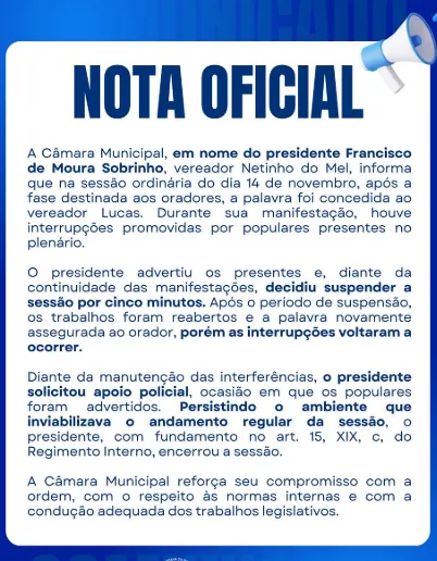 O presidente da Câmara, Netinho do Mel, emitiu uma nota nas redes sociais da Casa após o cancelamento, comentando o ocorrido.